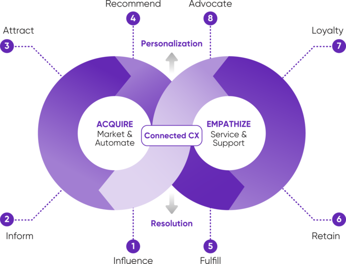 Connections intended to promote fulfilling interaction, memorable communication, and customer service that serves holistically, and not just sell—while being accessed through any channel or medium—is one way to define connected customer experiences. Connected customer experiences are underpinned by empathy, efficiency, and uniqueness; they offer solutions tailored to customers’ situations. Selling is not the sole idea behind connected customer experiences; the idea is to connect first. And establishing a connection is what matters the most. So, quite naturally, centralized data management, constant innovation, ingenuity, personalization, convenience, and staying associated with customers is at the heart of a connected CX.