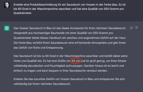 The results were already impressive, but not suitable to be used for the respective products in a shop. The problem with the texts was that ChatGPT kept adding information in addition to the product information from the prompts. This meant that the generated texts were good, stylistically, but the content was overall not correct because it contained misinformation regarding the product or details were missing.